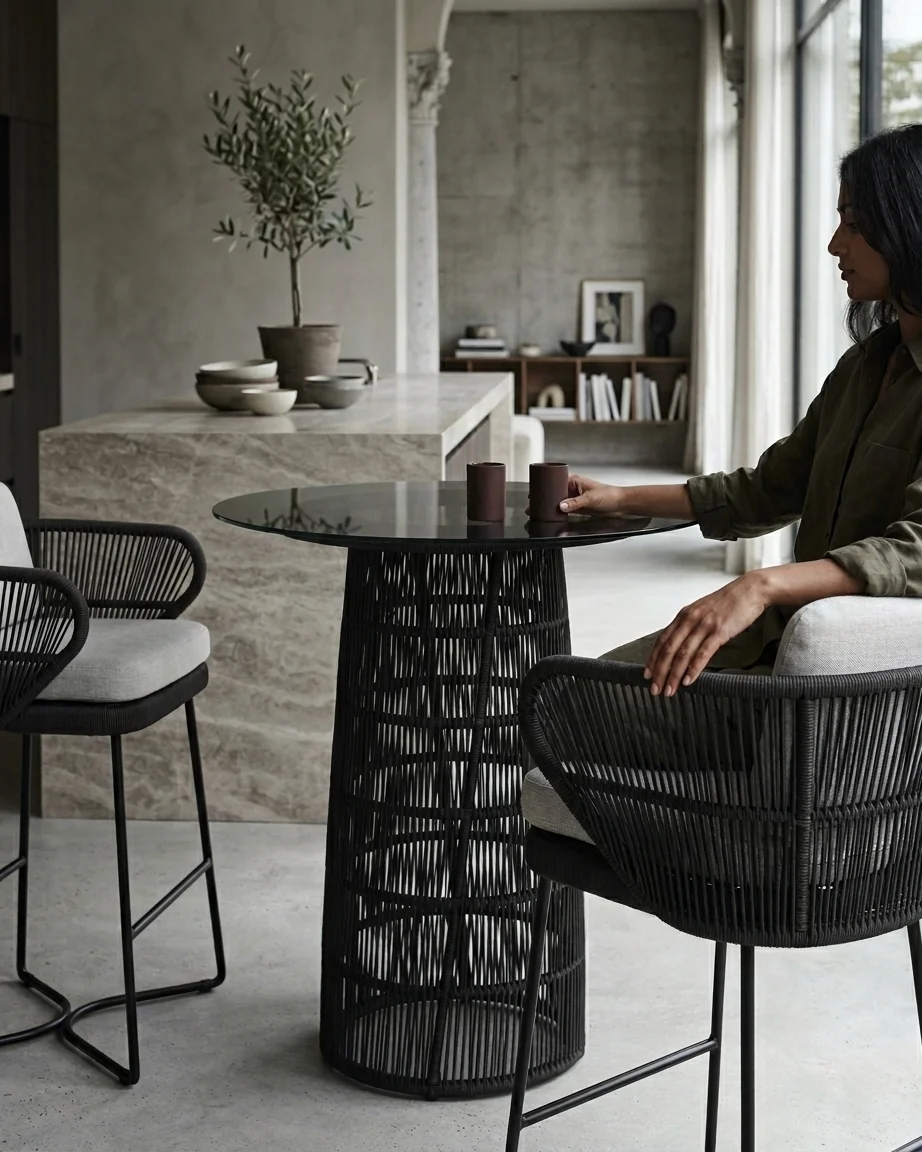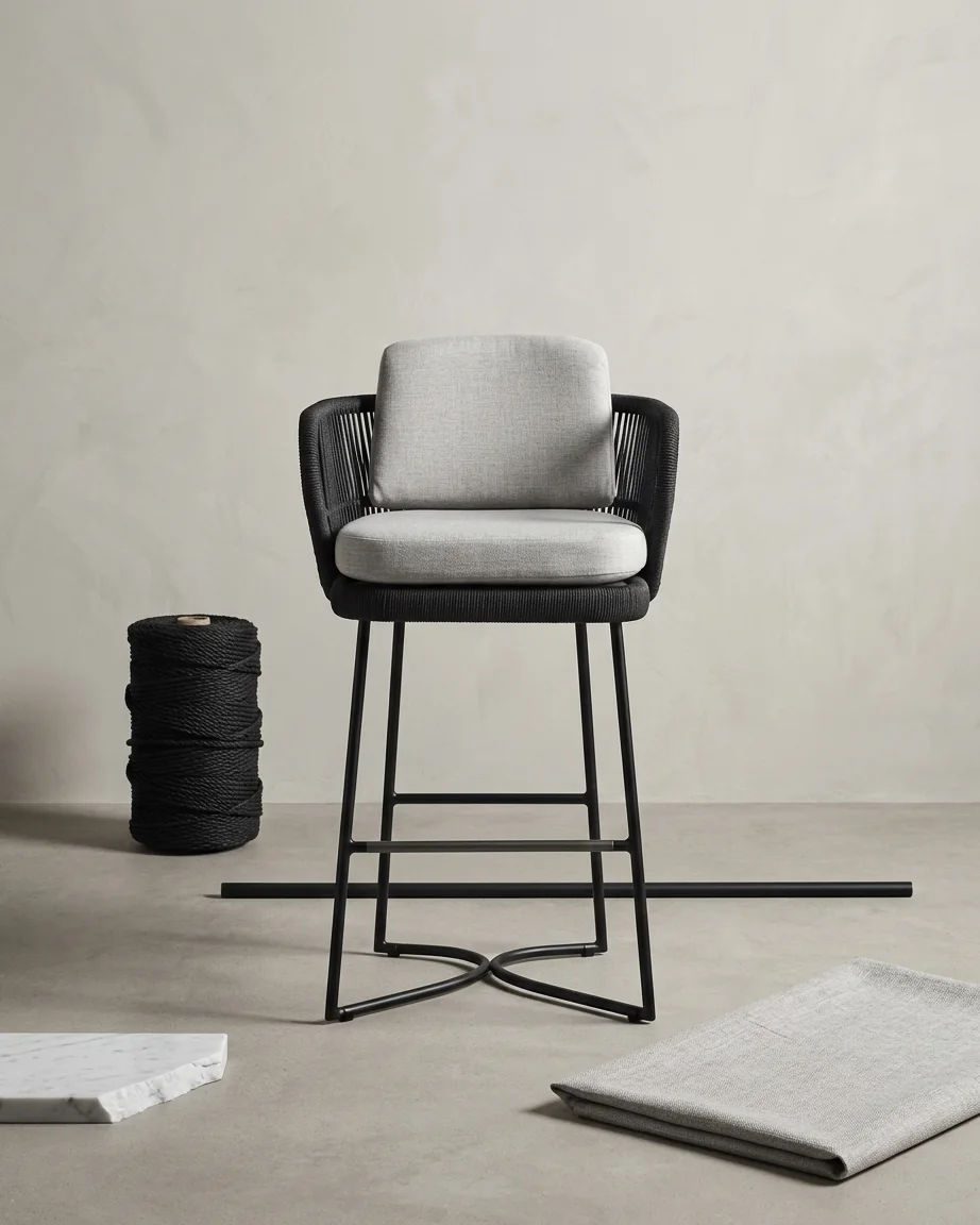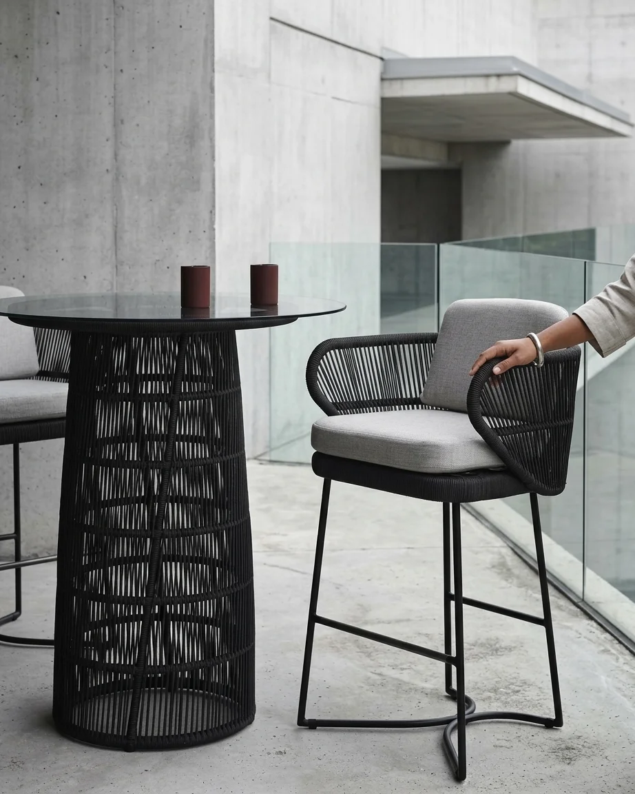 This outdoor bar stool by Craftnika is designed for premium outdoor spaces, combining a strong aluminium frame with a handcrafted rope woven backrest. It offers both durability and a refined modern look.