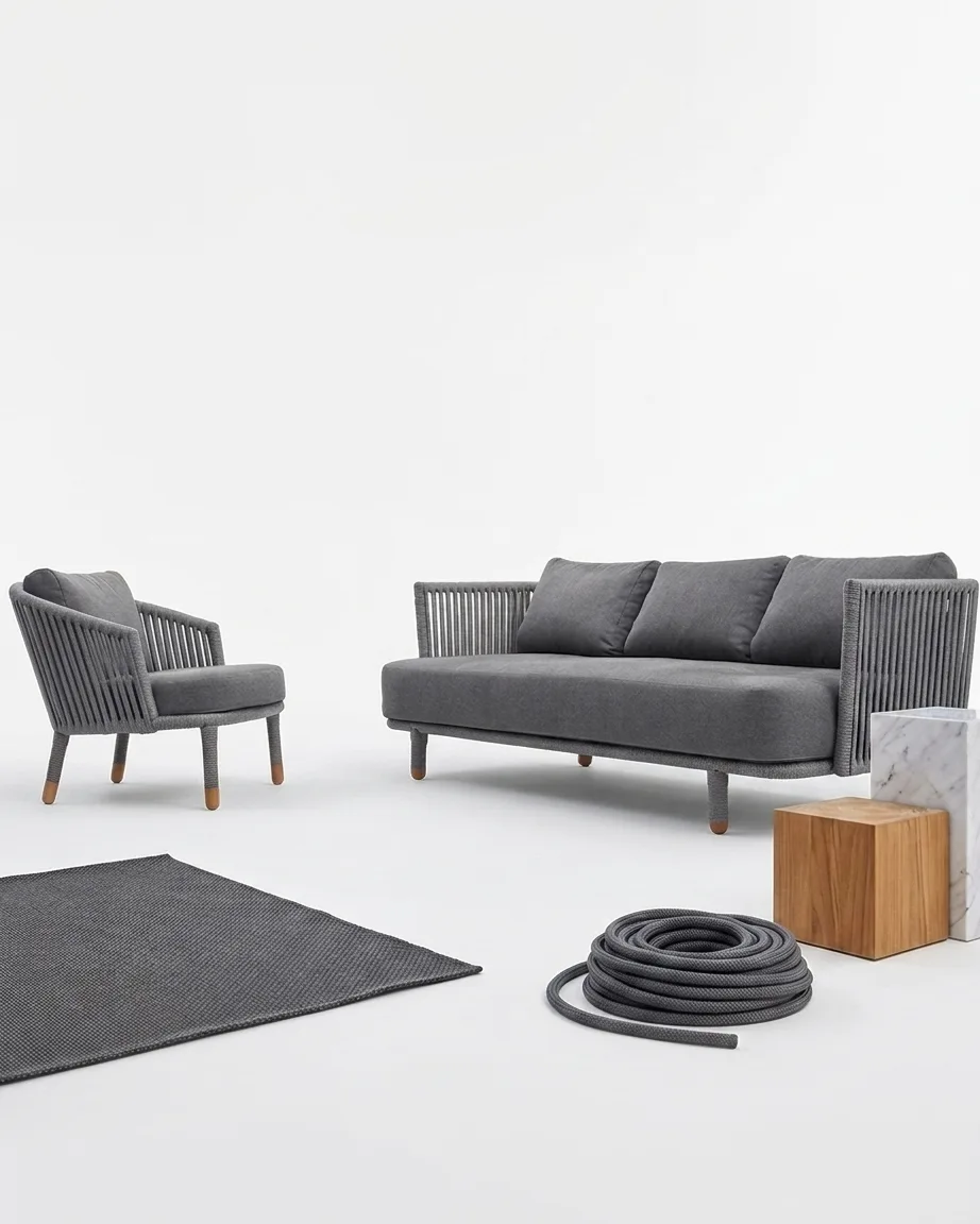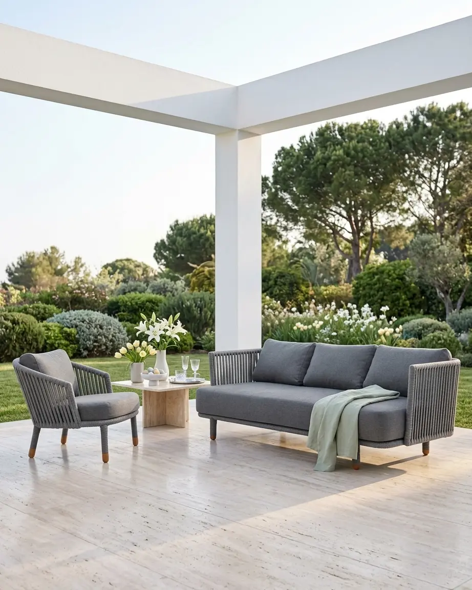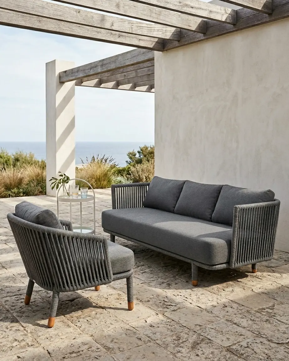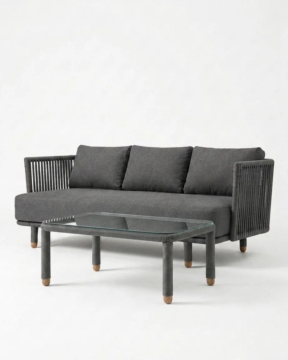 Designed for contemporary outdoor spaces, this premium outdoor sofa set by Craftnika combines clean lines with durable craftsmanship. The aluminium frame ensures long-term strength, while the rope detailing adds a modern and refined look to any setting.