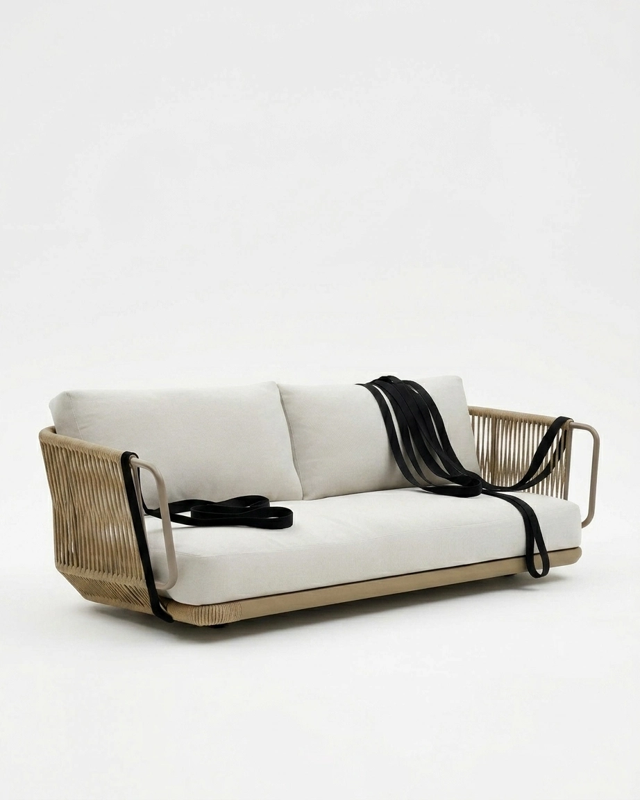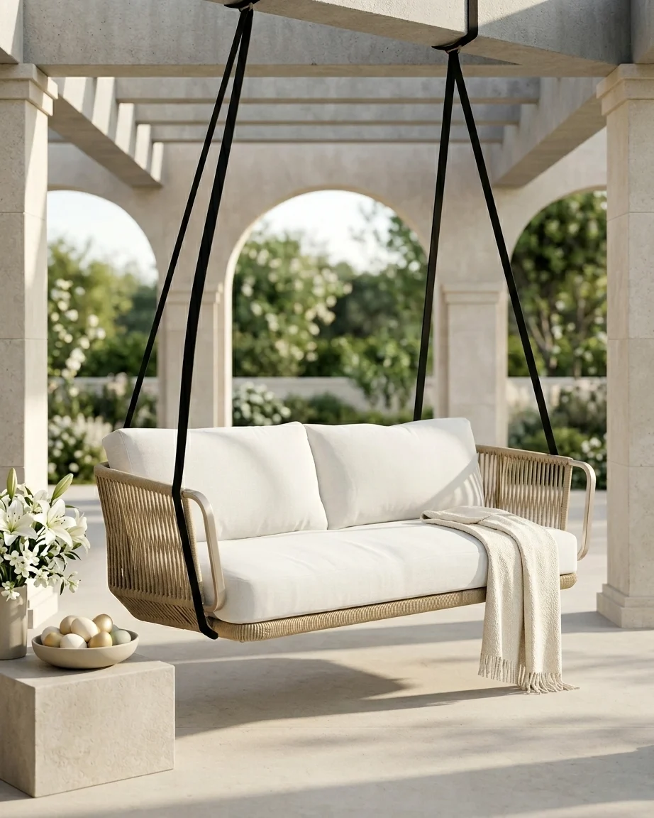 This outdoor swing sofa creates a relaxing and stylish seating area for modern outdoor environments.